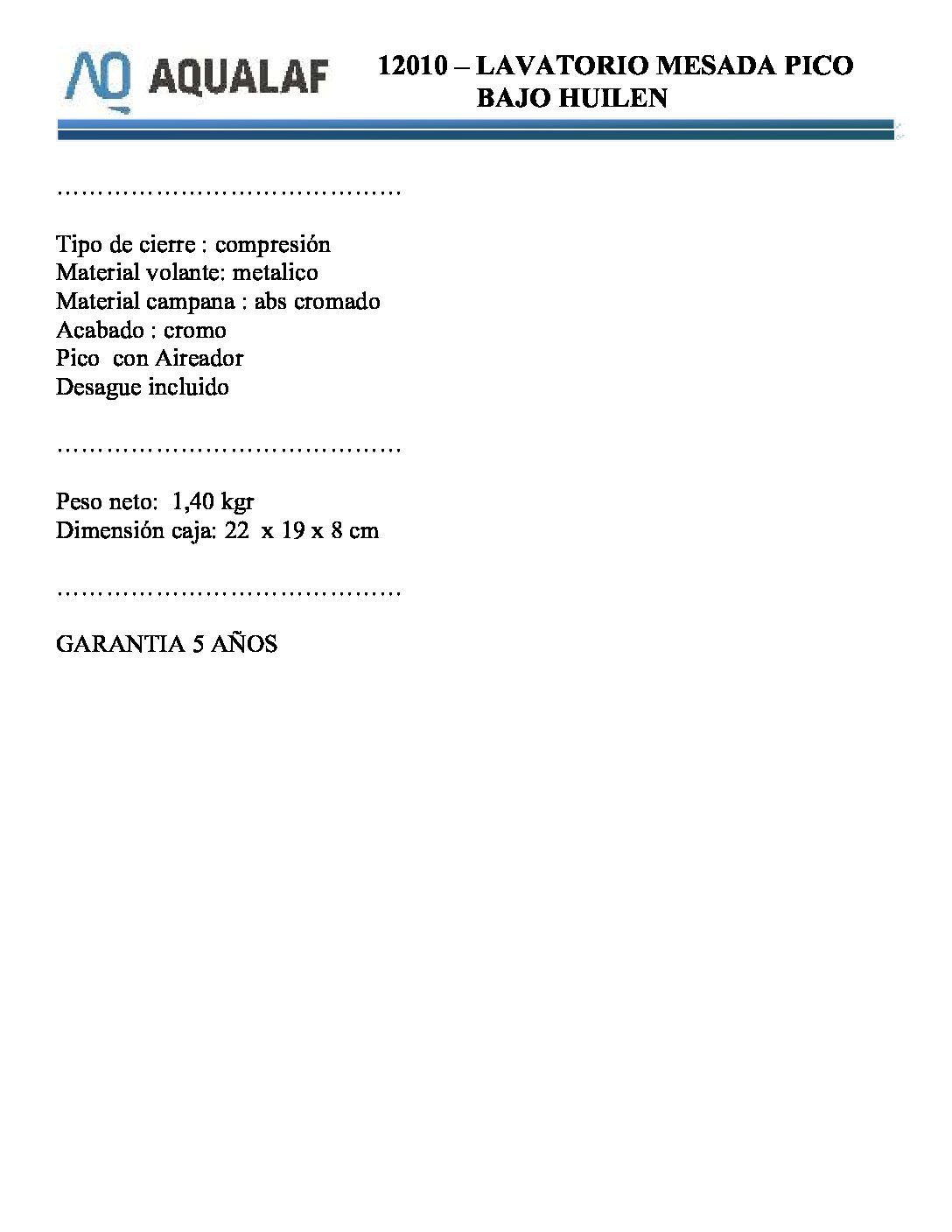 Grifería lavatorio Aqualaf 12010 Huilen Pico caño compresión P