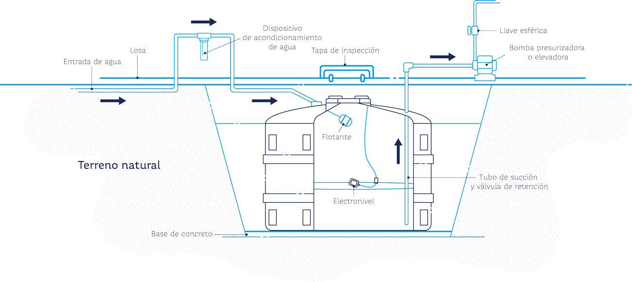 Dado que la cisterna es un producto para enterrar hay que considerar las condiciones del terreno. En terrenos donde la napa freática es alta o en superficie, sumado a la probabilidad de quedarse vacía por cualquier motivo o situación, recomendamos instalar la Cisterna Rotoplas Estándar. Esto se debe a que si el nivel de la freática se mantiene por encima del piso de la Cisterna por un periodo prolongado, el agua puede atravesar las paredes que rodean al tanque y generar presión hidrostática negativa provocando de encontrarse vacía, su colapso por flotación. Este fenómeno, se ha observado en la zona de Tigre/Benavidez donde recomendamos la instalación de la Cisterna Rotoplas Estándar por su resistencia la sumersión.